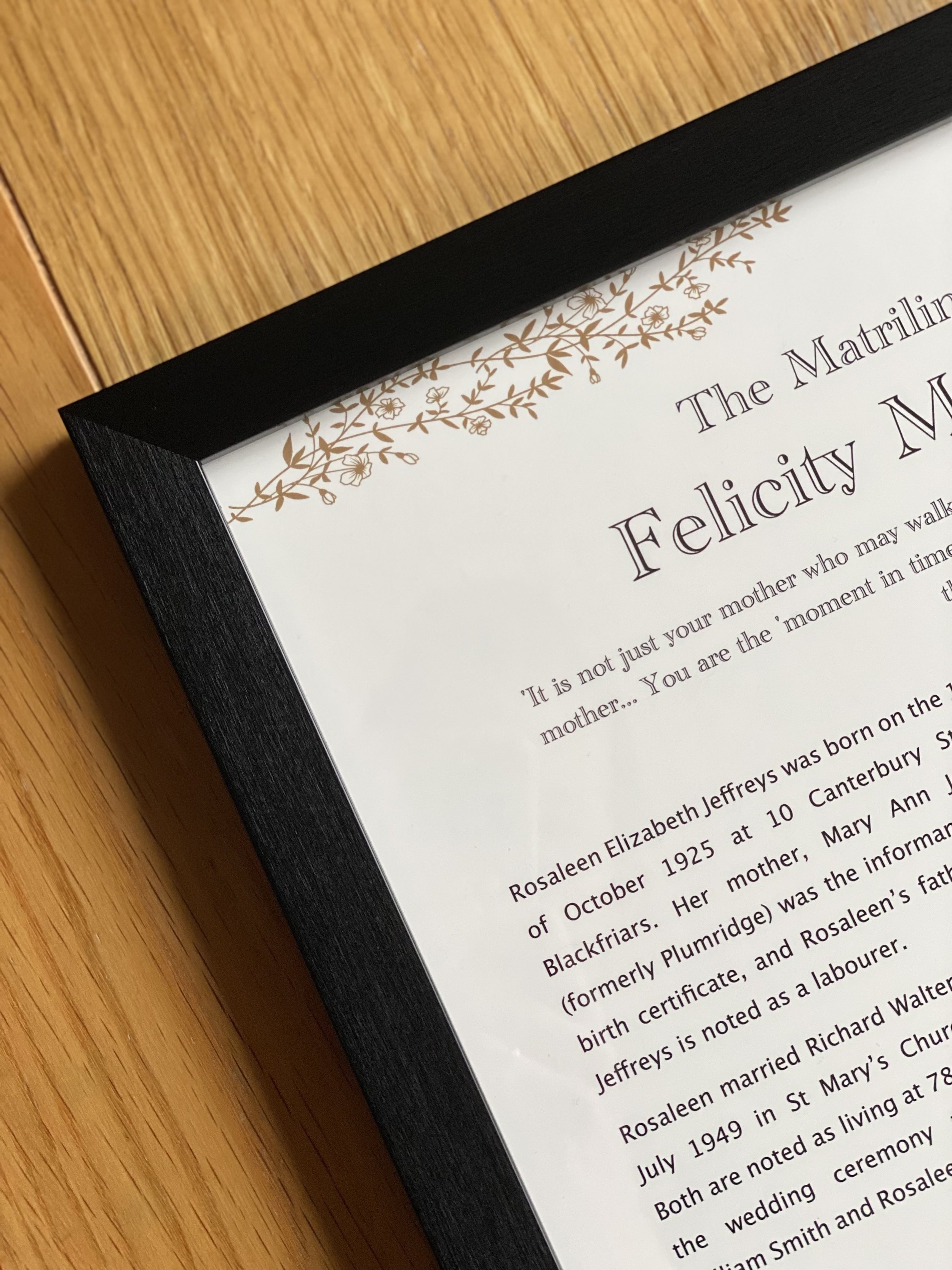 Your matrilineal line carefully researched back to at least 1800, and beautifully printed on A3 Giclée paper. A chance to celebrate the women who have carried your family’s story.